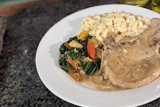 I stick with the meat-and-three tradition of using the cheap breakfast style chops, but I throw in some white wine and herb de Provence because I’m a…