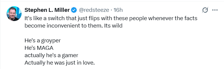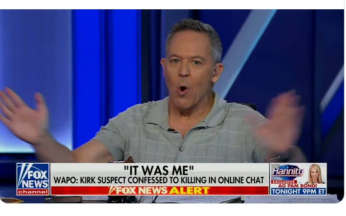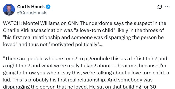 That Kirn Tweet has the embedded video of Matt Gutman fawning over texts between the man who murdered Charlie Kirk and his not-so-alleged-anymore lover, Lance Twigg, he described as “a very intimate portrait into this relationship between the suspect’s roommate and the suspect himself.” I’ll cut him slack on “into” because he was speaking on live TV, but that’s forgiveness for the least of his trespasses though I can’t decide which of two possibilities he’s also guilty of. Either he’s just discovered that people capable of terrible and evil acts don’t twist their mustache ends and sneer every moment of their lives, that they are capable of normal behavior despite their defining acts, or he believes his audience a bundle of fools who’ve never discovered it themselves. If the former, he should be embarrassed, take an inventory, and then take whatever steps are needed to catch up with everybody else his age. If the latter, he should take a much more thorough inventory and reconsider his opinion of himself relative to others.