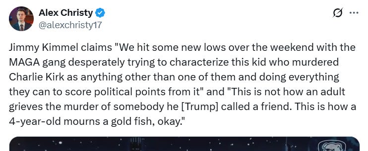 That’s a remarkable take. Charlie Kirk was killed because of his politics. The killer was angry because of the political message Charlie preached and successfully defended. That the murderer felt personally threatened by a political message doesn’t make his an a-political murder.