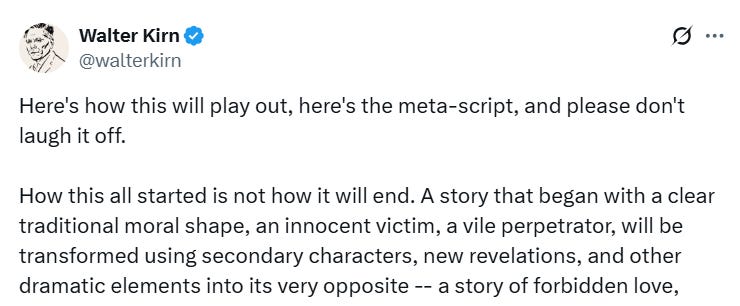 “Here's how this will play out, here's the meta-script, and please don't laugh it off. How this all started is not how it will end. A story that began with a clear traditional moral shape, an innocent victim, a vile perpetrator, will be transformed using secondary characters, new revelations, and other dramatic elements into its very opposite -- a story of forbidden love, persecution by religious bigots, a poignantly rebellious heartfelt protest against a World that Doesn't Understand. There will then be a total split, far deeper than mere "politics," between the segments of the public that were captivated by two incommensurate tragedies.”