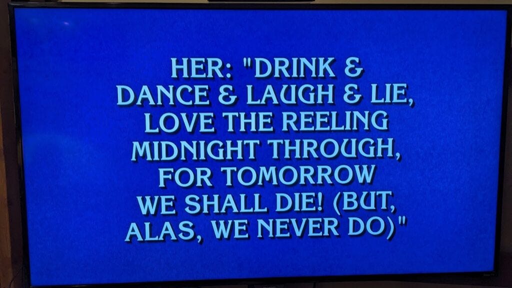 UPDATE: This post was originally published the morning of 10/13/23. I was watching Jeopardy later that evening while making dinner and Ken Jennings gave a quote as a clue. I started laughing because I knew the quote and knew (KNEW!) what was going to happen. A contestant buzzed in and answered, “Who is Emily Dickinson.” He got the sad beep and a quick “Sorry No.” No one else buzzed in, time ran out, and Ken said, “It’s actually Dorothy Parker.”