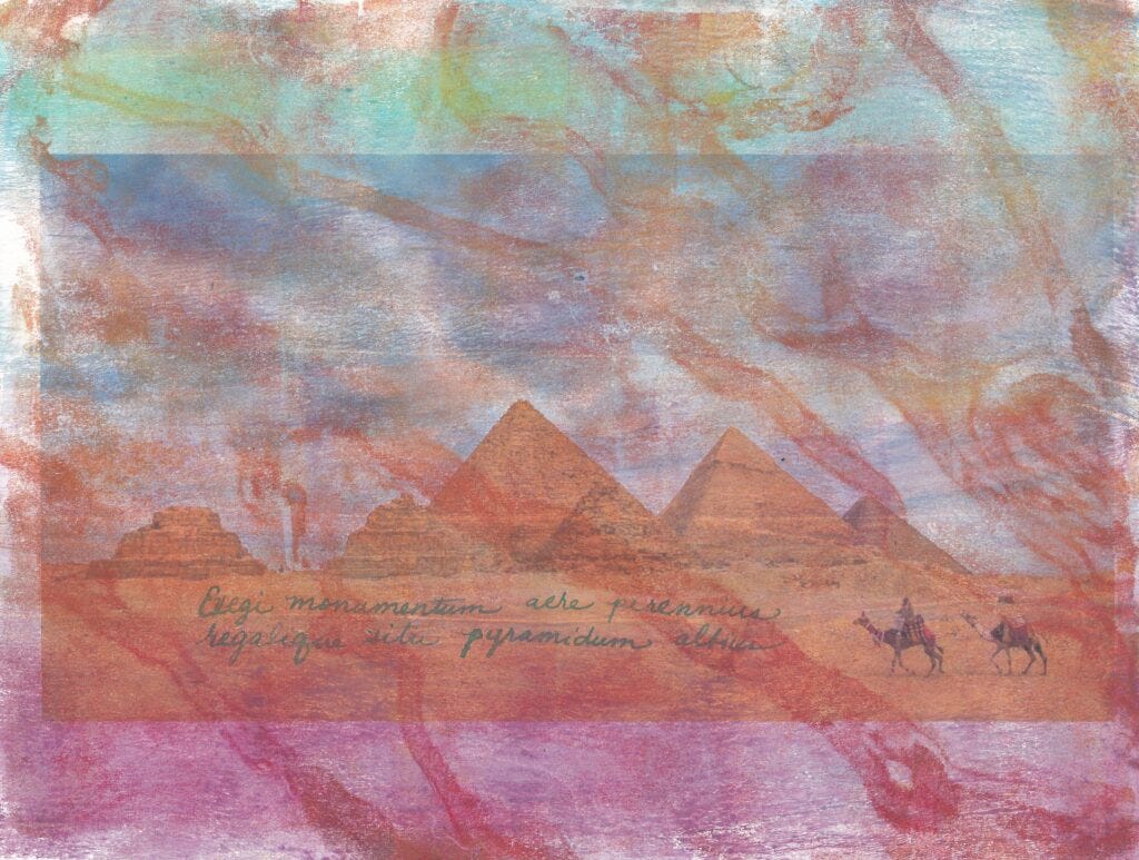 This week’s poem is numbered thirtieth in book three, or “Ode III, XXX” as it seems correct to call it. He wrote in iambs in his epodes, and hexameter in his epistles and satires, according to Wikipedia. Conventional stuff. Not in the odes. “Ode III, XXX” is a triumph given to himself, a brag about adapting Sappho’s meters for Latin use.