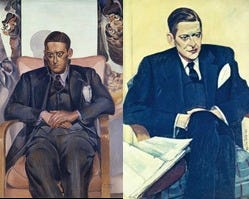 His portraits, the ones he painted, could be wonderful. He made at least two of T.S. Eliot whose work first appeared in England in Blast, a magazine co-founded by Lewis and Ezra Pound. The first shows an unassuming man practically hiding in a respectable but ill-fitting suit. The second, a later work, has Eliot at ease. This time the suit is bright and eye-catching with a large handkerchief as plumage in the breast pocket. The poet-playwright transformed the drab banker. It’s good stuff.