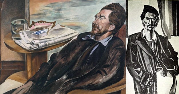 He painted Ezra Pound several times, but two stand out. The first is, in the Tangye/Mitchison style, Pound in repose. He’s an older and accomplished man relaxing while hopefully not pondering treason. The other is highly stylized and energetic. It’s the public Pound, the image cultivated by green velvet suits with blue buttons and imperious declarations of “Make it new!”