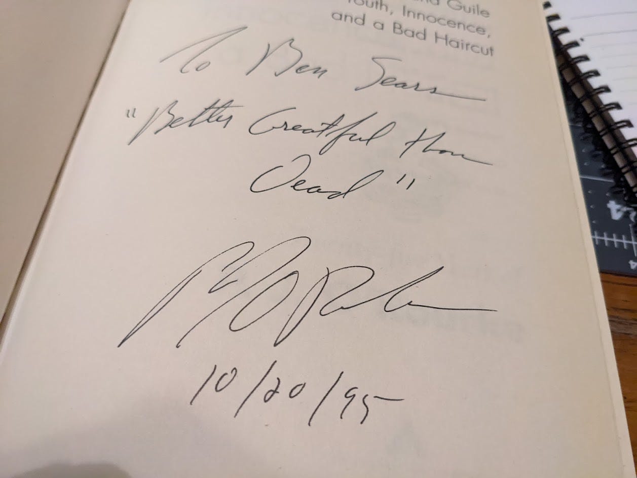 He was doing a book signing at a now defunct Birmingham mall and thankfully the distracting woman I was driving with was not so distracted by me as she managed to keep an eye open and yell hysterically making me hit the brakes on the Toyota Four Runner to stop in its tracks as I was a mere three feet from running over one of my favorite authors in the parking lot.