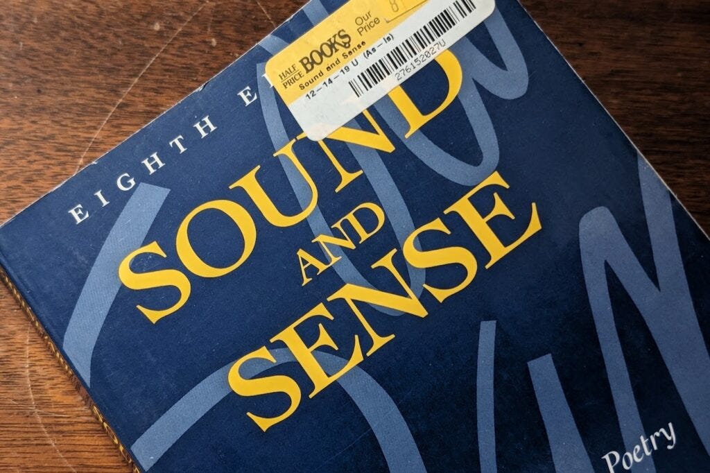 Sound and Sense bills itself in the preface as “written for the college student who is beginning a serious study of poetry,” but that’s akin to a producer’s pitch to Glenn Close. “This role is perfect for you. She’s an attractive middle-aged woman whose grandson has a break down in his last year of medical school.” It’s age flattery. There’s nothing in it that can’t be gleaned by a high school kid. I’d imagine college students might feel a little ticked off, spoken down to.