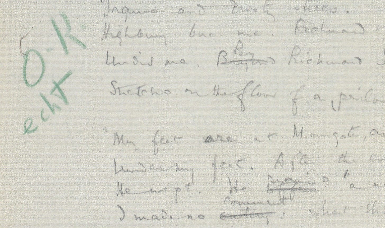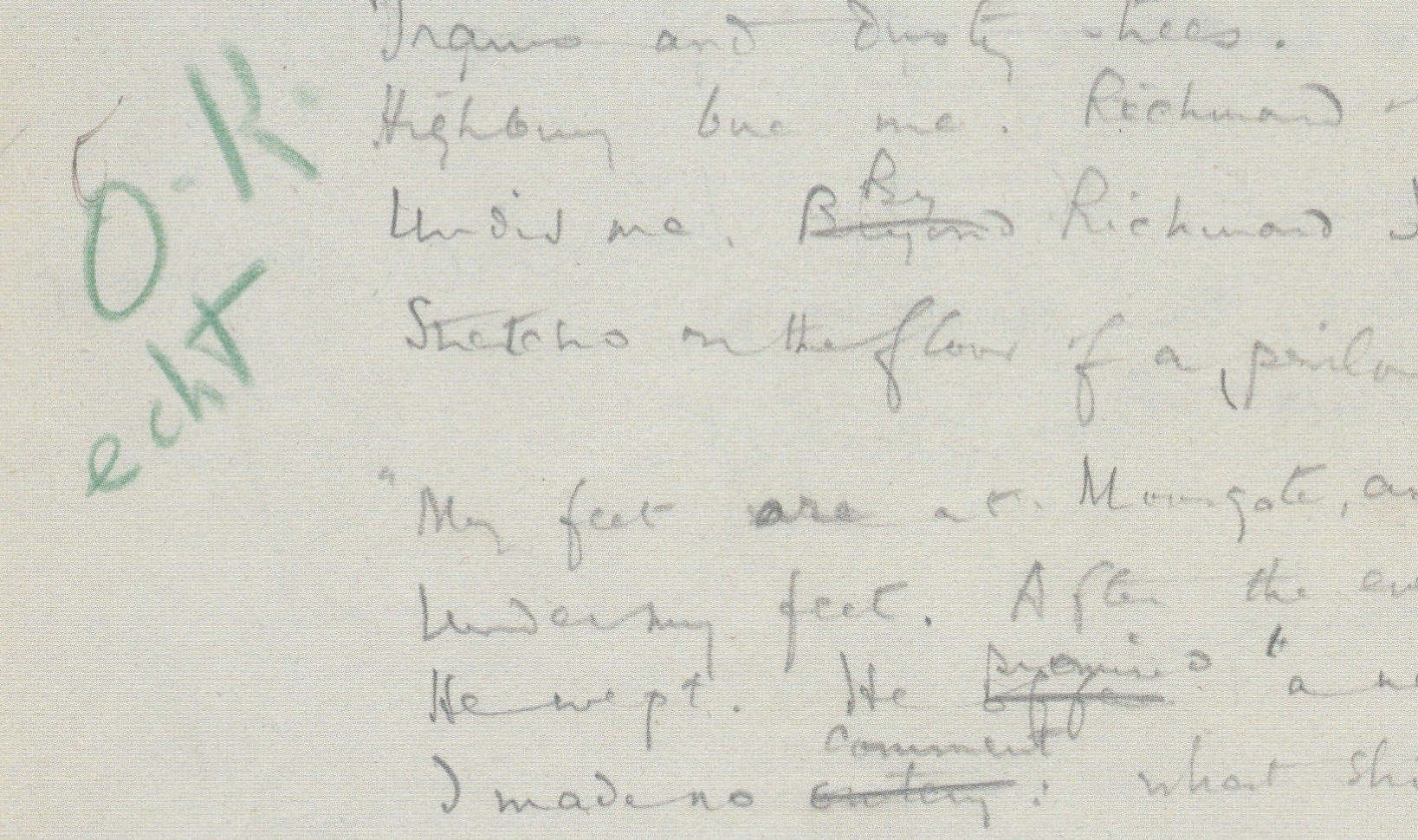 Ford and Perry speak to Pound’s grasp of Eliot’s aims, his recognition of what was essential. He was ruthlessness in striking chaff. “Echt,” meaning real, authentic, or true, peppers the margins. Pound’s scrawled “Echt” to the right of part III’s “A rat crept softly through the vegetation,” and with a line indicating the whole stanza, an green crayon “O.K. echt” to the left of “Highbury bore me. Richmond + Kew / Undid me,” later in the same part. Eliot wasn’t sure what he had. I have in my notes that he told someone—and I can’t seem to put my hands on who that someone is, so let’s say Richard Aldington because I’m pretty certain it was him— that he believed there were thirty good lines in the poem. Pound the Imagist treated the ethos of the poem directly, left absolutely no word that does not contribute to the presentation.