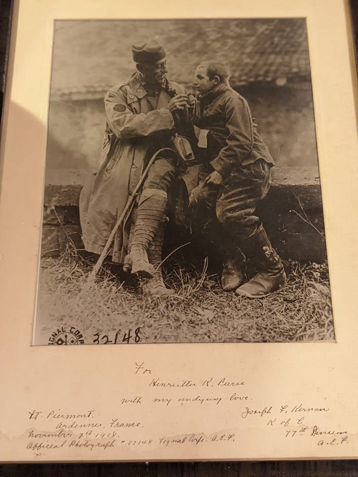 Either above or below the Graves letter–both have been banished without prejudice sadly to the closet–was a picture of my… I’m not sure. He was my great grandmother’s uncle, so I suppose that makes him my great-great-uncle, but my understanding of such classifications is so off that he may well be my fiftieth cousin thrice removed. But there was a picture of a guy I’m related to named Joe Kernan with a German prisoner during WWI on Dad’s study wall with the Graves.