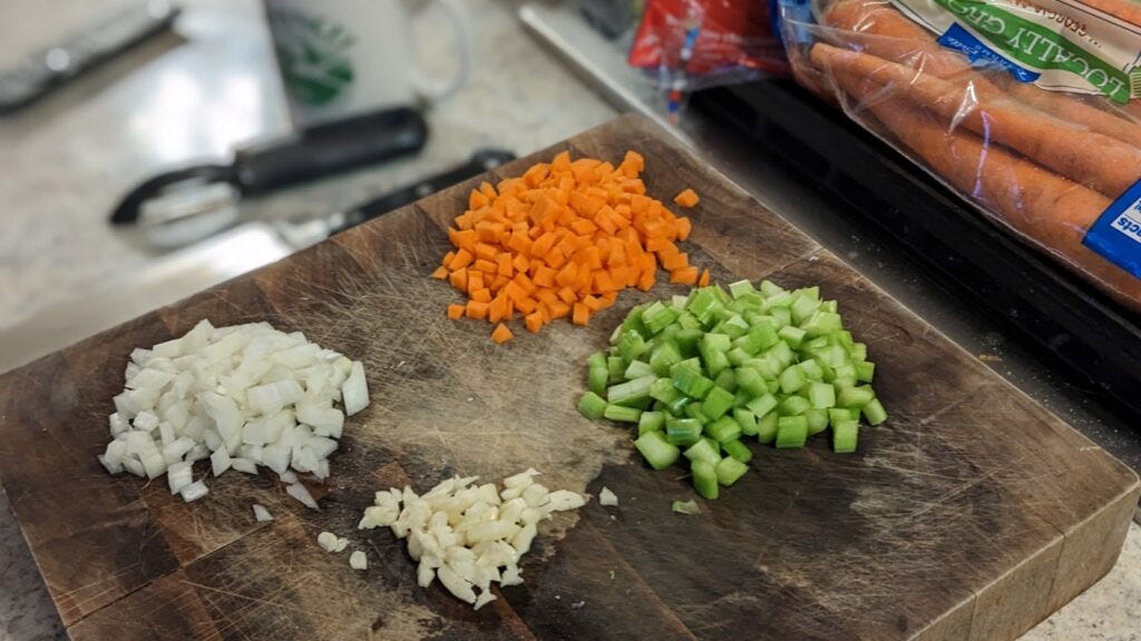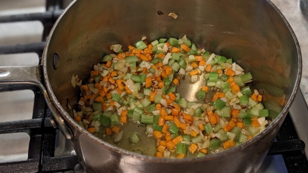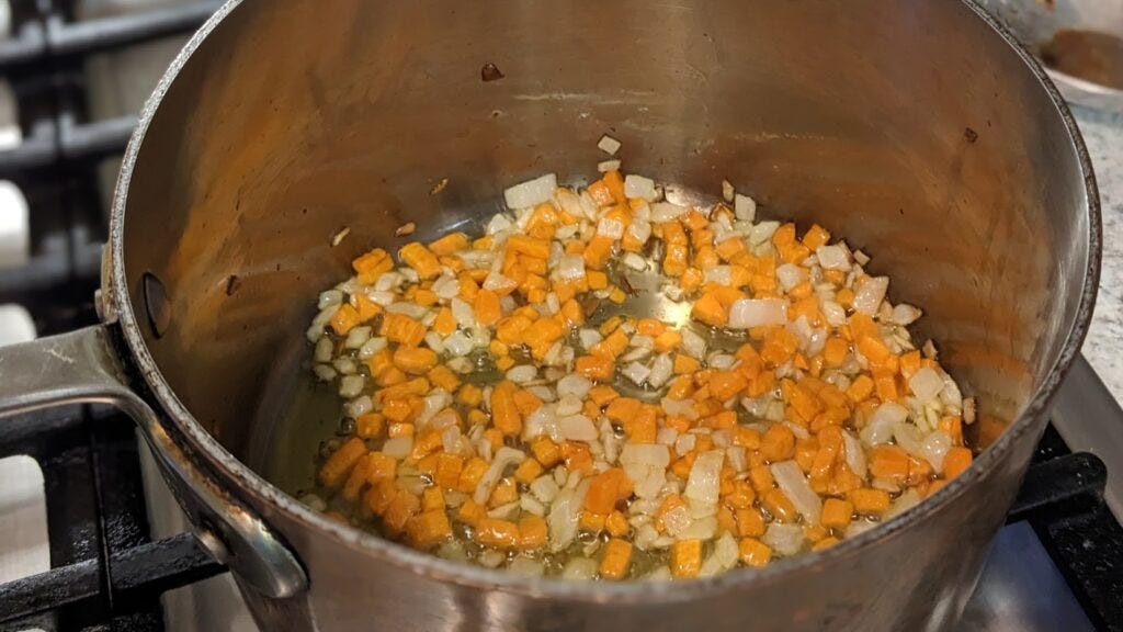Add a few glugs of olive oil to a sauce pan over medium-high heat and throw in the onion and carrots. Usually when sauteing mirepoix I start with the onions and cook until their translucent and aromatic and then add the celery and carrots so the water in the celery will sweat and keep the onion from charring and the carrots from caramelizing but I want dark flavors in this sauce, so let them go without celery for a while, stirring occasionally, until some of the onions start to brown on the edges. No salt yet.
