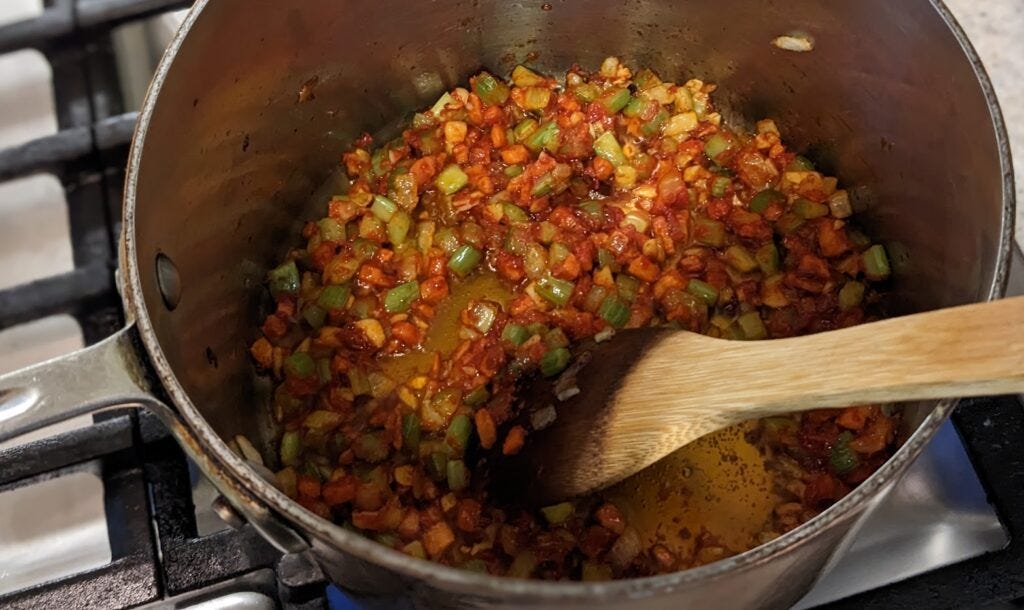 Add the tomato paste and mix well. Cook another two or three minutes, adding garlic to the pan for the last minute or so. For some reason the garlic is easy to forget, so stay sharp.