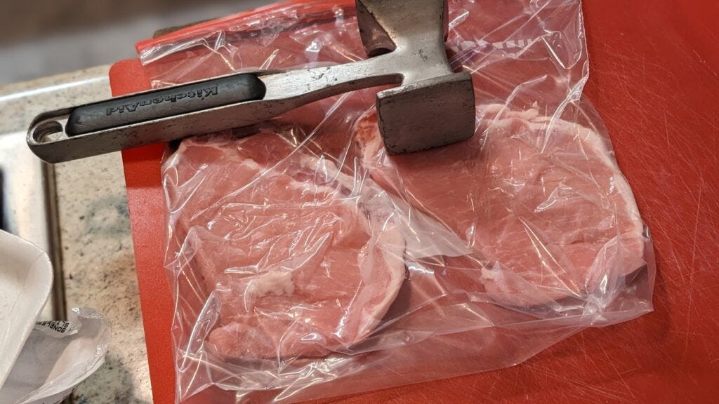 Take the already thin pork chops and lay them out on a cutting board with a clear plastic bag or cling wrap covering and pound them with a meat hammer or the bottom of a small pan until they’re around 1/8th of an inch thick.