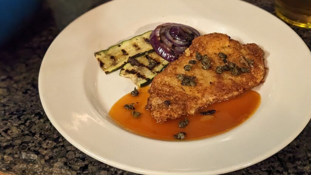 But that’s veal. Pork, steak, and even chicken or fish are substituted as a concession to cost. Most in both nations considers anything but veal to be lesser. I don’t. I’ve rarely gotten much out of veal. To paraphrase P.J. O’Rourke, it’s like dating a model: cute and alluring at first, but ultimately boring and expensive. I far prefer pork.