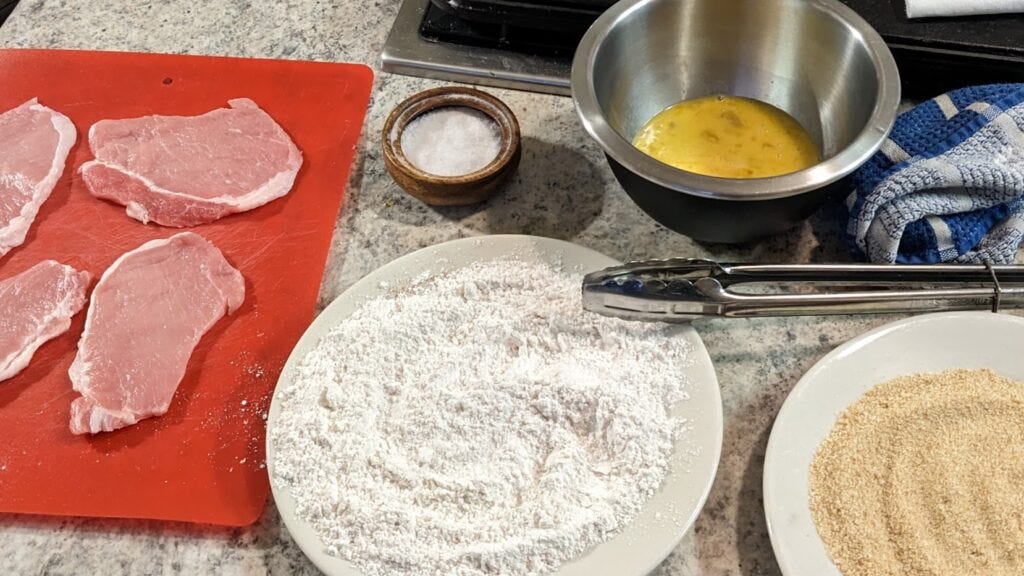 When the oil is hot, lightly salt the chops, dredge in flour, coat in egg, and then coat in bread crumbs. Do this in batches. The oil should be fine for three to four of the batches before needing to be replaced.
