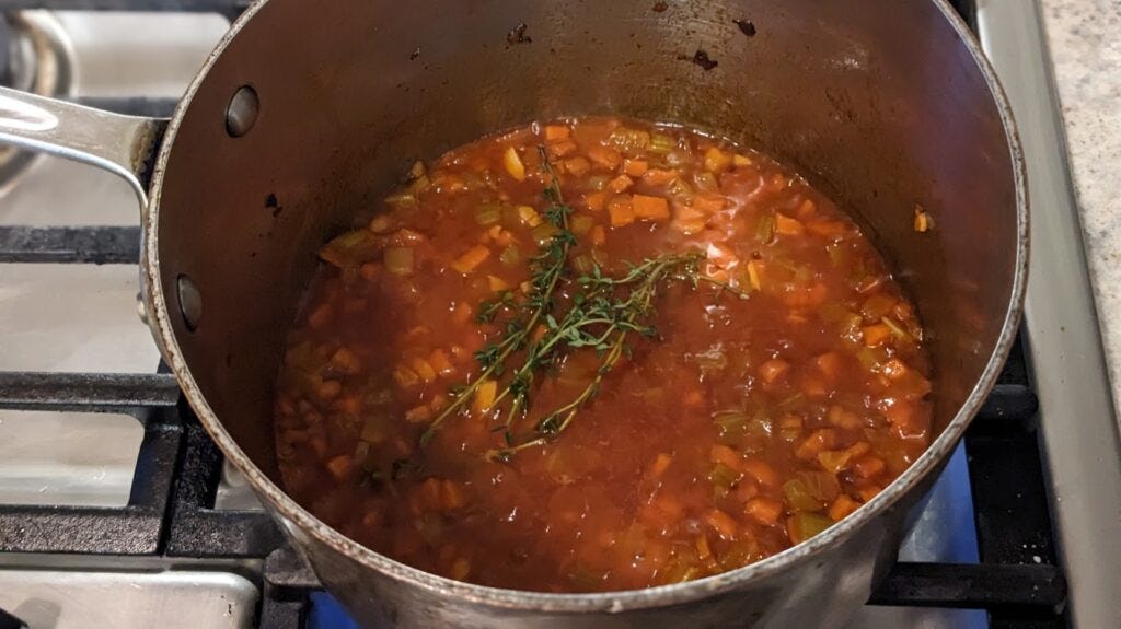 Next comes the thyme, wine, and bay leaf. Keep at a medium-high heat until the wine reduces by half.