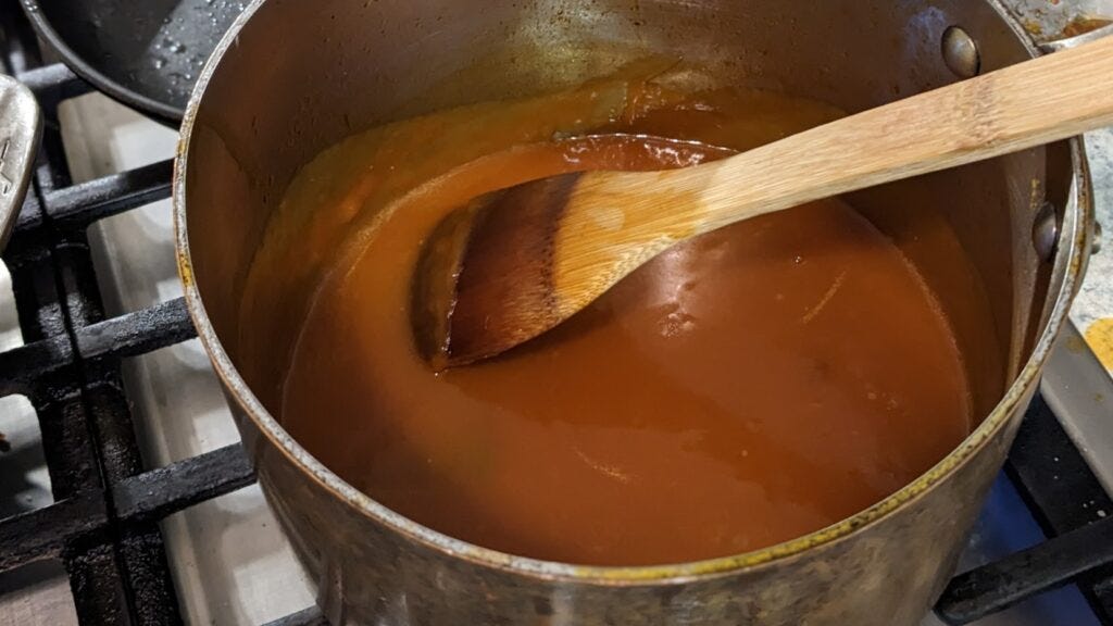 Add the stock and reduce by a third or so and then strain through a sieve and return sauce to the pan. If you’re like me you’ll save the solids from the sieve to put over eggs the next day. Start with a tsp. of cornstarch and whisk into the sauce. If needed, keep adding little by little until you have the right viscosity. It should coat the back of a metal spoon. I can never manage to break up all the clumps of cornstarch so I usually pass through the sieve a second time. Salt to taste.