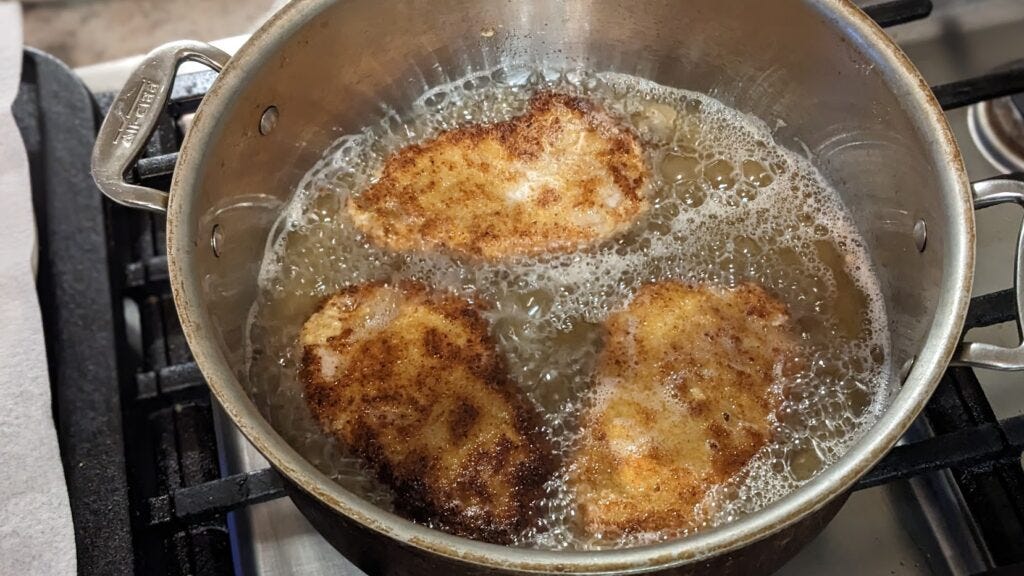 Pour vegetable oil into a skillet or Dutch oven style pan. You want enough to submerge the chops to the midway point. Heat the oil to 325°. At least aim for 325°. My oil fluctuated from 300° to 340° and everything worked out.