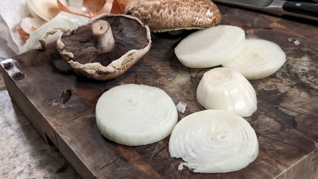 Rub the mushrooms and onion with olive oil and liberally salt and pepper. I started this with a pepper craving so, spread over all ingredients, I used roughly one Spanish galleon’s worth. You probably don’t want to commit as heavily, but when I say “liberally” maybe take me to mean “Liberally” where pepper is concerned.