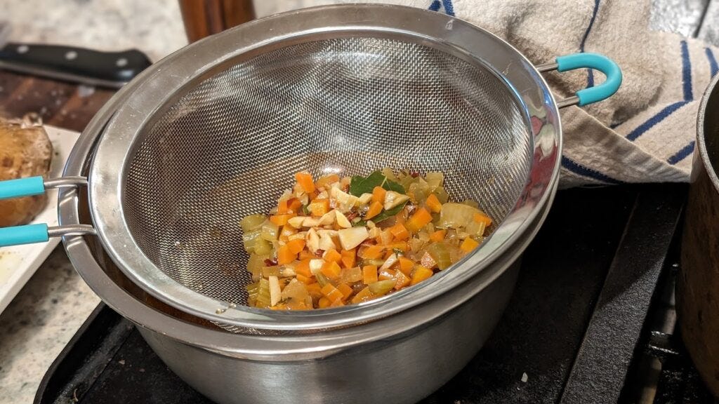 After the sauce has simmered, strain it through a sieve. Everything’s had time to add what it brought. Take a minute to look at the picture above. I’ve mentioned this when writing about similar sauces, but I’m going to beat this drum again anyway. That stuff is gold in an omelet. Don’t throw it away.