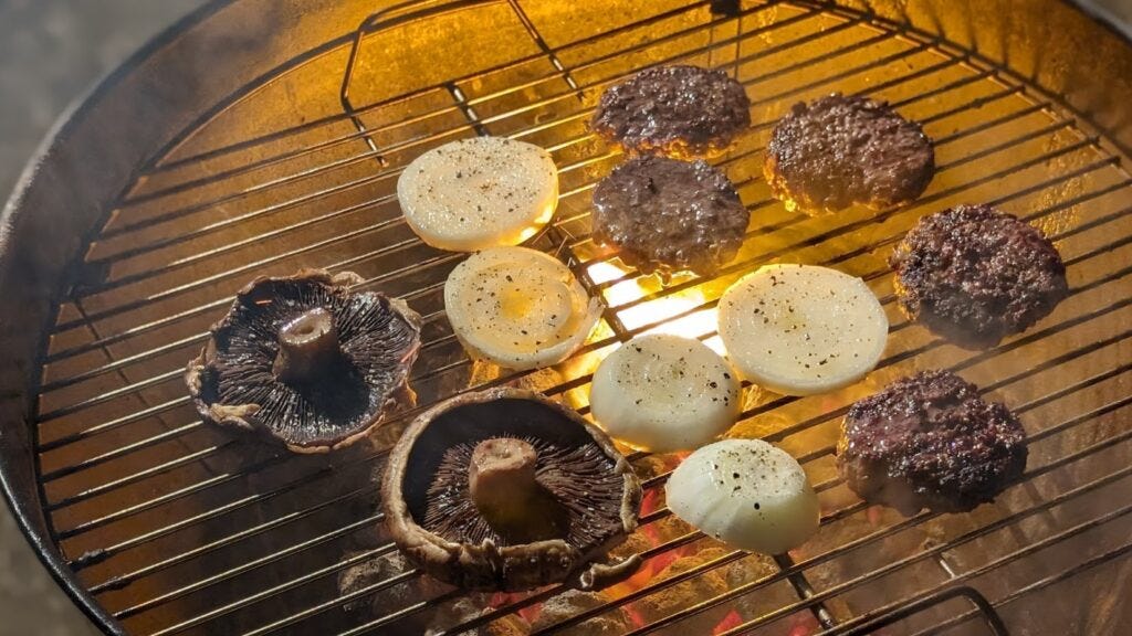 Cook the burgers to taste and try to get some char on the onions and mushrooms.