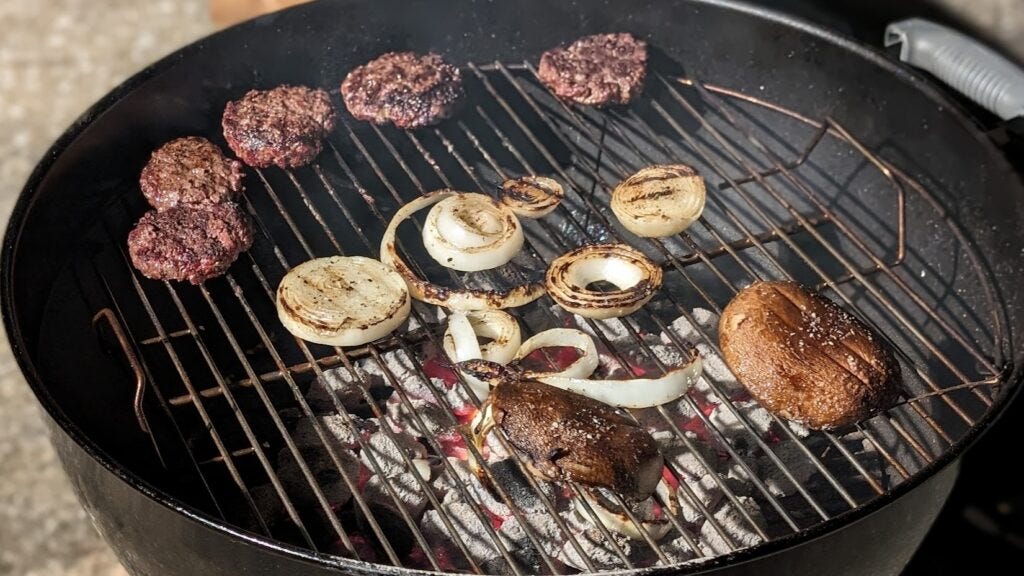 The burgers need a head start, so I hold off putting the mushrooms and onions on until at least the first burger flip. There are people who believe that a perfect burger needs only one flip. They have been misled. That’s a post in itself, so I’ll get back to that point some other time.
