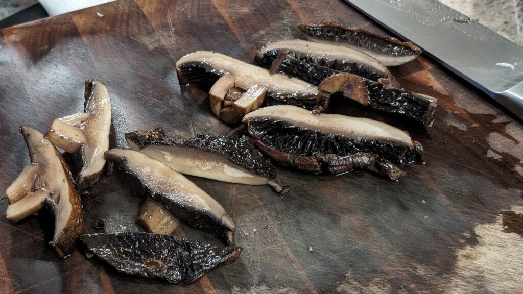 Pull everything off the grill. Slice the mushrooms. Taste the sauce and correct for salt and pepper.