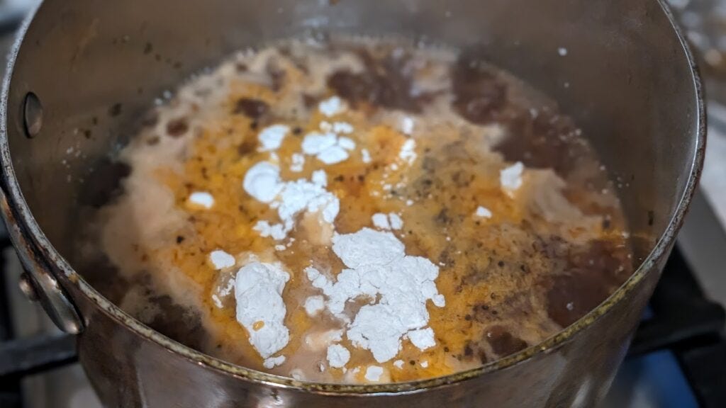 Pour the strained liquid back into the saucepan over low heat. It’s time to add arrowroot. Look at the picture above.