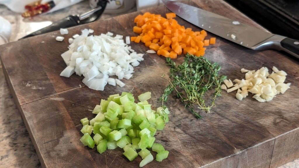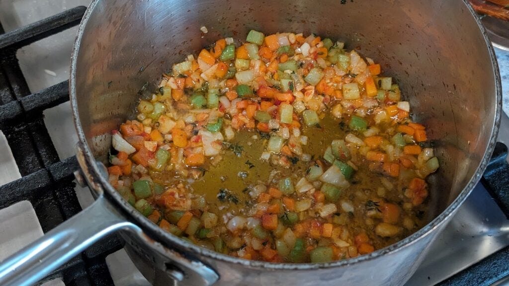 Start with the sauce. It can be made ahead and reheated if that’s your druther. Pour a few glugs of olive oil into a saucepan over medium heat and add the onions and carrots. When the onions start towards translucent, add the celery and thyme. Cook until both celery and carrots start to dull, 3-5 minutes. Add garlic and then half a minute or so later add the tomato paste.