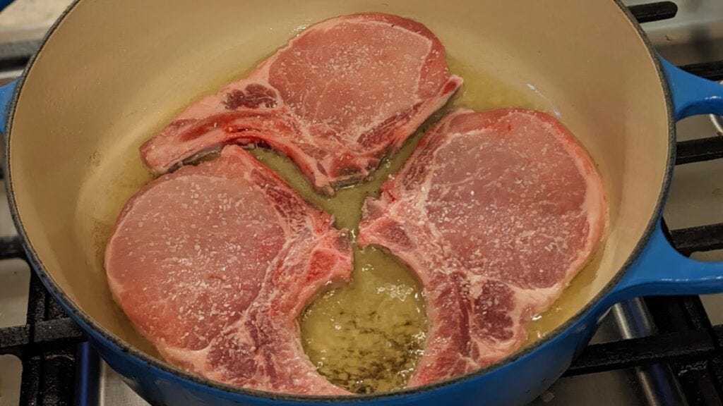 Add a few glugs of olive oil to a Dutch oven or similar pan over medium high heat put in the chops.