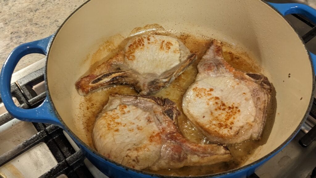 Remove the chops to a plate and set aside. Add the sliced onions and sauté for five or so minutes until they start turn translucent in spots and a few pieces start to brown.