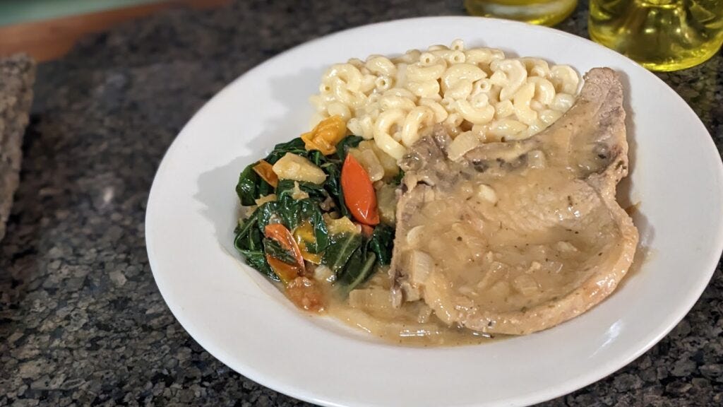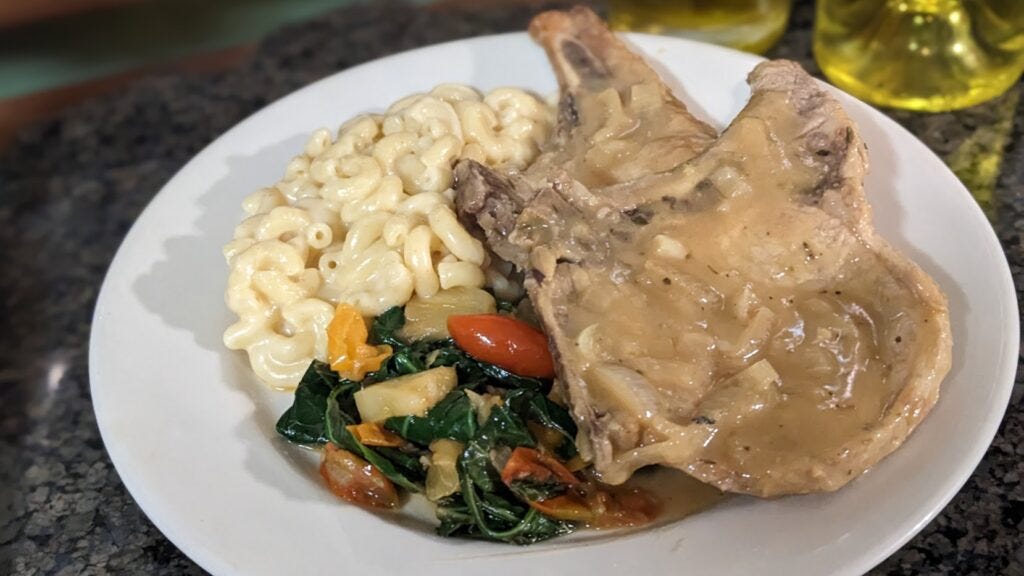 I never mastered fried chicken. The vegetables came easily. Salisbury steak was a breeze. What I liked best, though, was smothered pork chops in an onion gravy. I stick with the meat-and-three tradition of using the cheap breakfast style chops, but I throw in some white wine and herb de Provence because I’m a snob at heart.