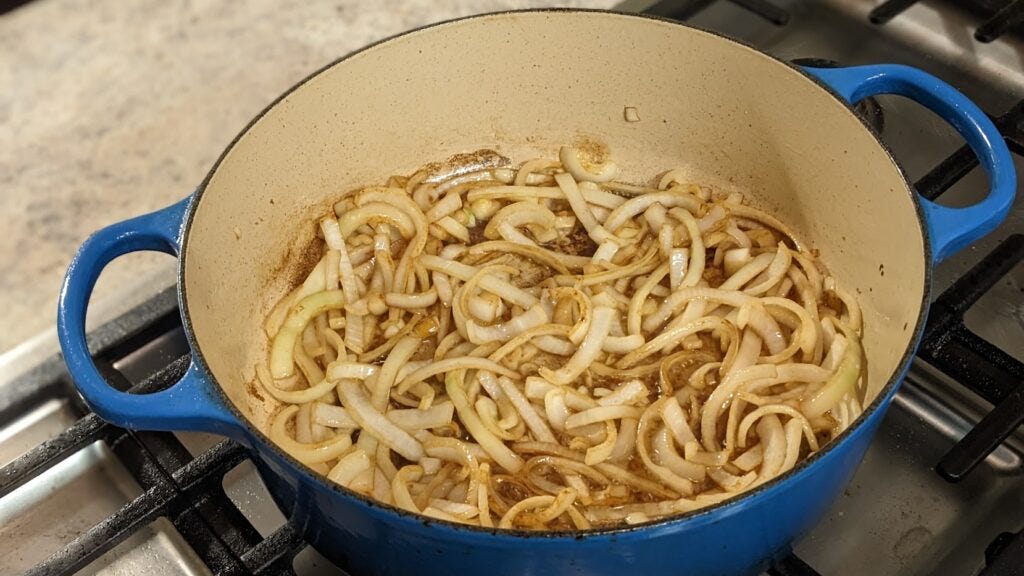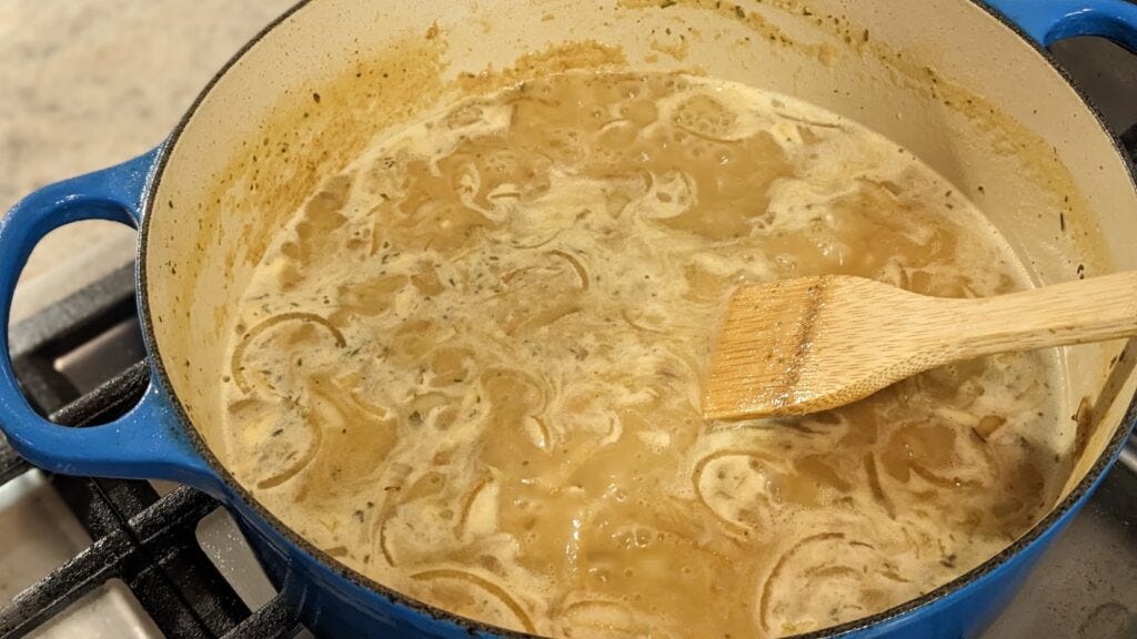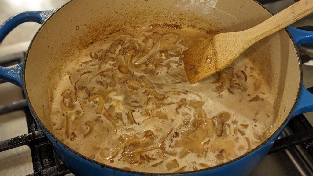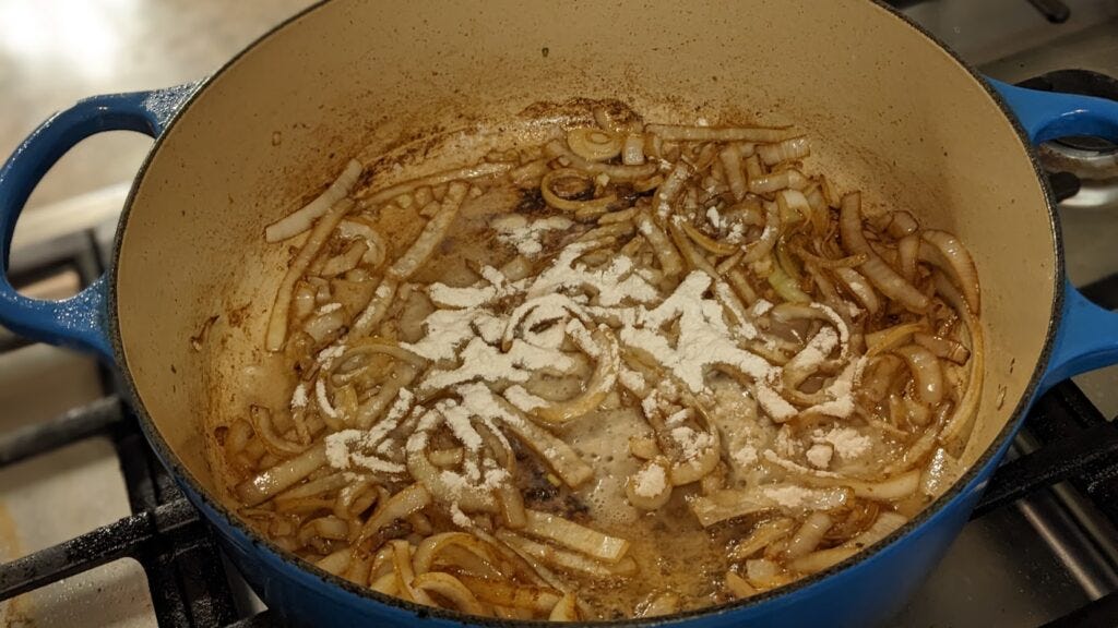Add 3 tbsp of flour and toss the onions to coat. Cook for three or four minutes more.