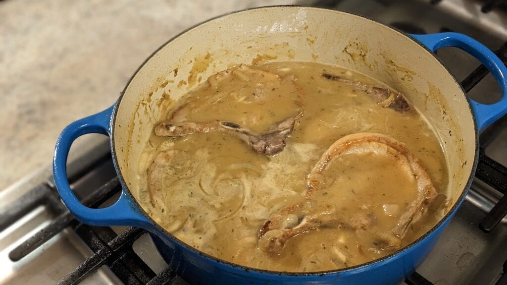 I stick with the meat-and-three tradition of using the cheap breakfast style chops, but I throw in some white wine and herb de Provence because I’m a snob at heart.