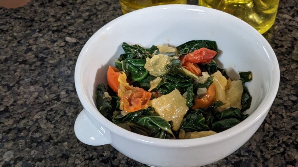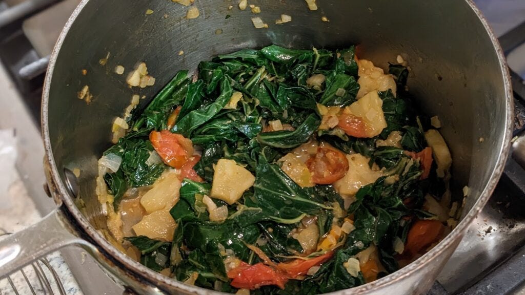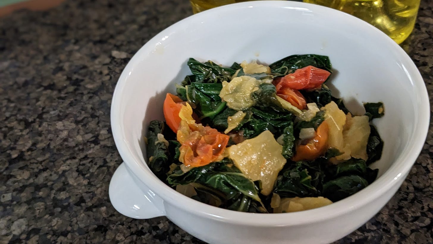 My home version of a tonier restaurant's Spicy Pineapple Collard Greens. It seems off the wall, and it is, but it's very good.