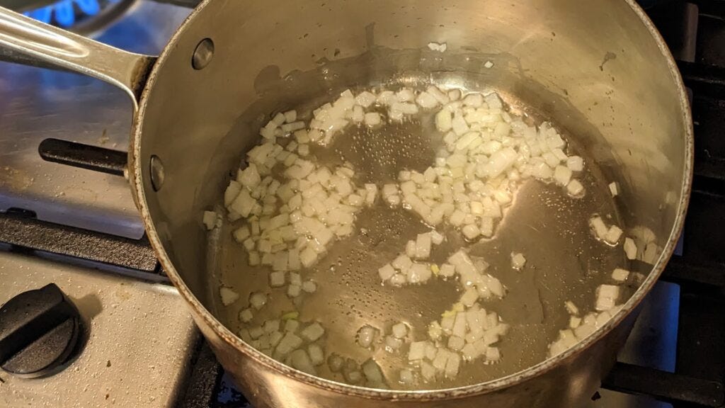 Start with a few glugs of olive oil in a saucepan over medium heat. Add the onion and sauté until aromatic and starting to turn translucent.
