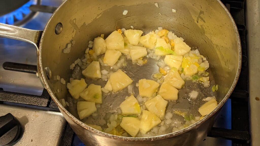 Next add the pineapple and sweat for a minute.