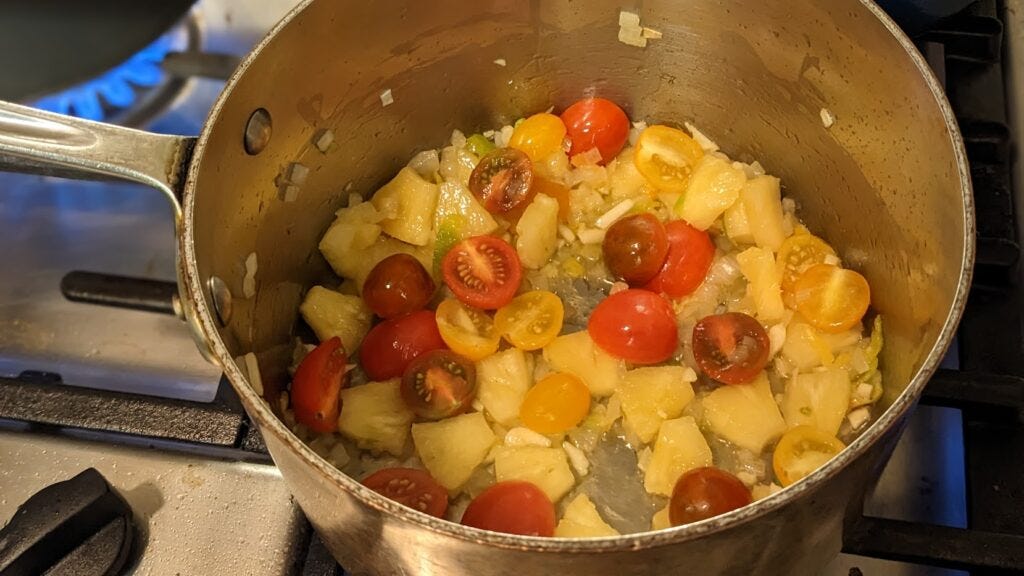 If you prefer, you can add tomatoes instead of pineapple first. All you’re doing by putting in either a bit early is to add moisture. I’m trying to avoid acrid garlic and the juice from the tomatoes or pineapple reduces the chance of excessive browning. Either way, now you want the garlic, tomatoes, pineapple, habanero in the pot with the onions and stir them around for four or five minutes. You’re looking for the peppers to fade in color and the tomatoes to soften.