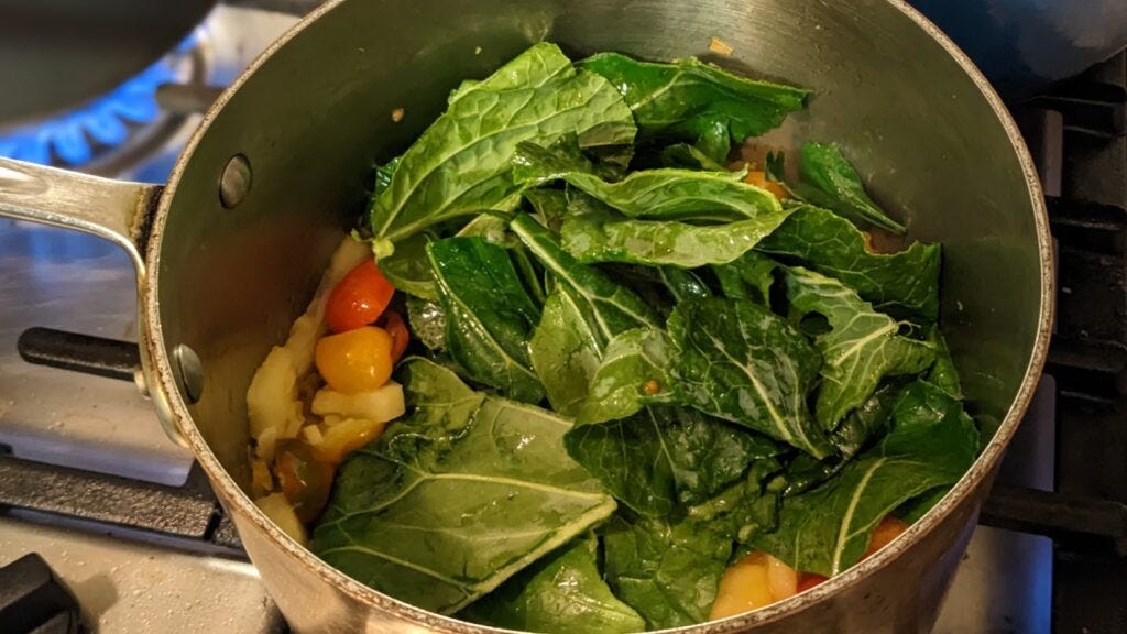 Now add the collards and stir to moisten. I didn’t put a quantity for greens in the ingredients list because it’s up to you. Wilting takes a lot and makes it a little so start with a couple of handfuls of greens, cook them down and add another. Repeat or not until you are happy.