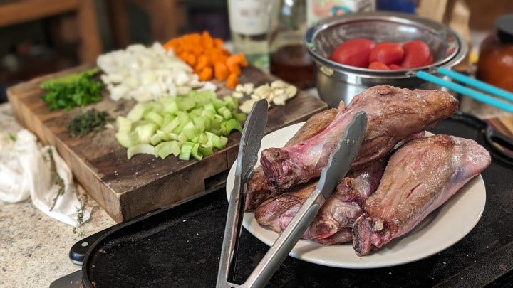 This is a recipe for Springtime. It’s lamb shank in a white wine vegetable braise; rustic osso buco. I’m a sucker for lamb shank, but almost always cook it in red wine. I like the leftovers over pasta and rich and bold are nitrous oxide injections to my rigatoni obsession. This time, the weather was newly warm and sunny, I went lighter and for the first time incorporated my Calabrian pepper oil into the process. I’ve done that with marinara before, but with braises I’ve held it back as a condiment for table use. It worked.