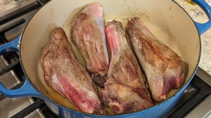 Submerge the lamb as best you can and reduce heat to a low simmer. Cover and let it go for 45 minutes to 1 hour – some shanks are thicker than others.