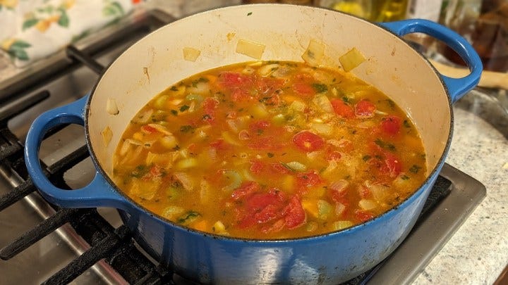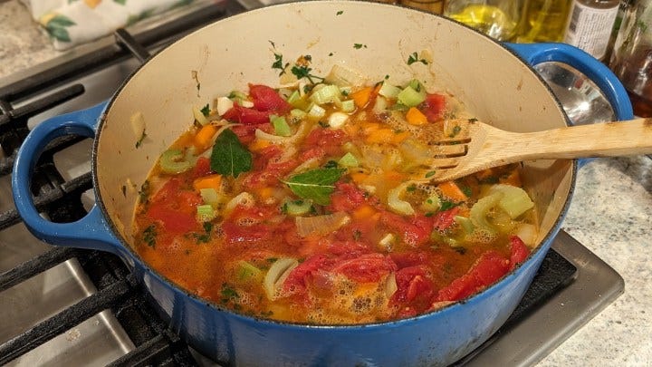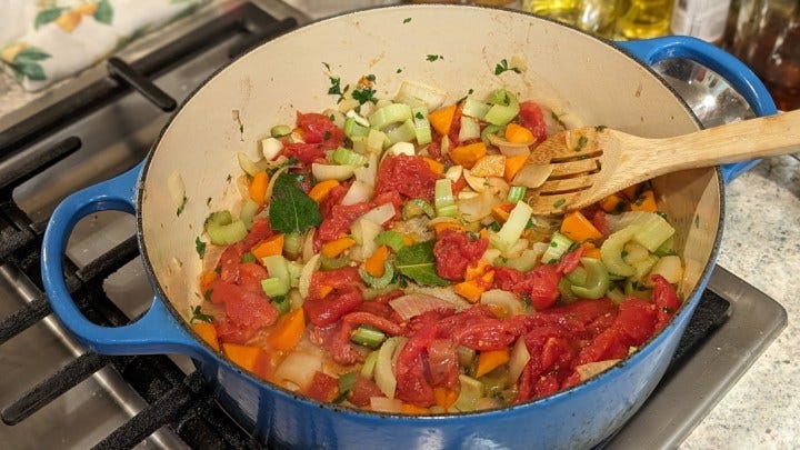 Start with onion and carrots and sauté over medium-high heat until the onions sweat and turn towards translucent. Next add the celery. I tasted at this point and added more pepper oil. When it turns to a dull green, add the garlic, tomatoes, parsley, and thyme.