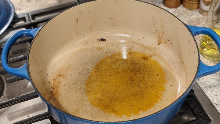 Wipe the grease out of the bottom of the pan with a paper towel. Or not. You won’t mess anything up if there’s meat juice in the sauté. Just be wary of pops and resulting eye seeking oil drop explosions.