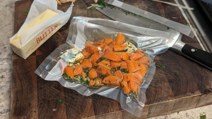 I forgot to get a picture of the squash, onion, and Parmesan fritters my wife made. I sealed some carrots with cumin, ginger, butter, flat leaf, salt, and pepper and cooked them sous vide. If that doesn’t sound right to you, gnocchi, broccoli, asparagus, or limas would do well. My thoughts are something vibrant and something with a slight crunch to pair with the lamb. Lentils would do well too.