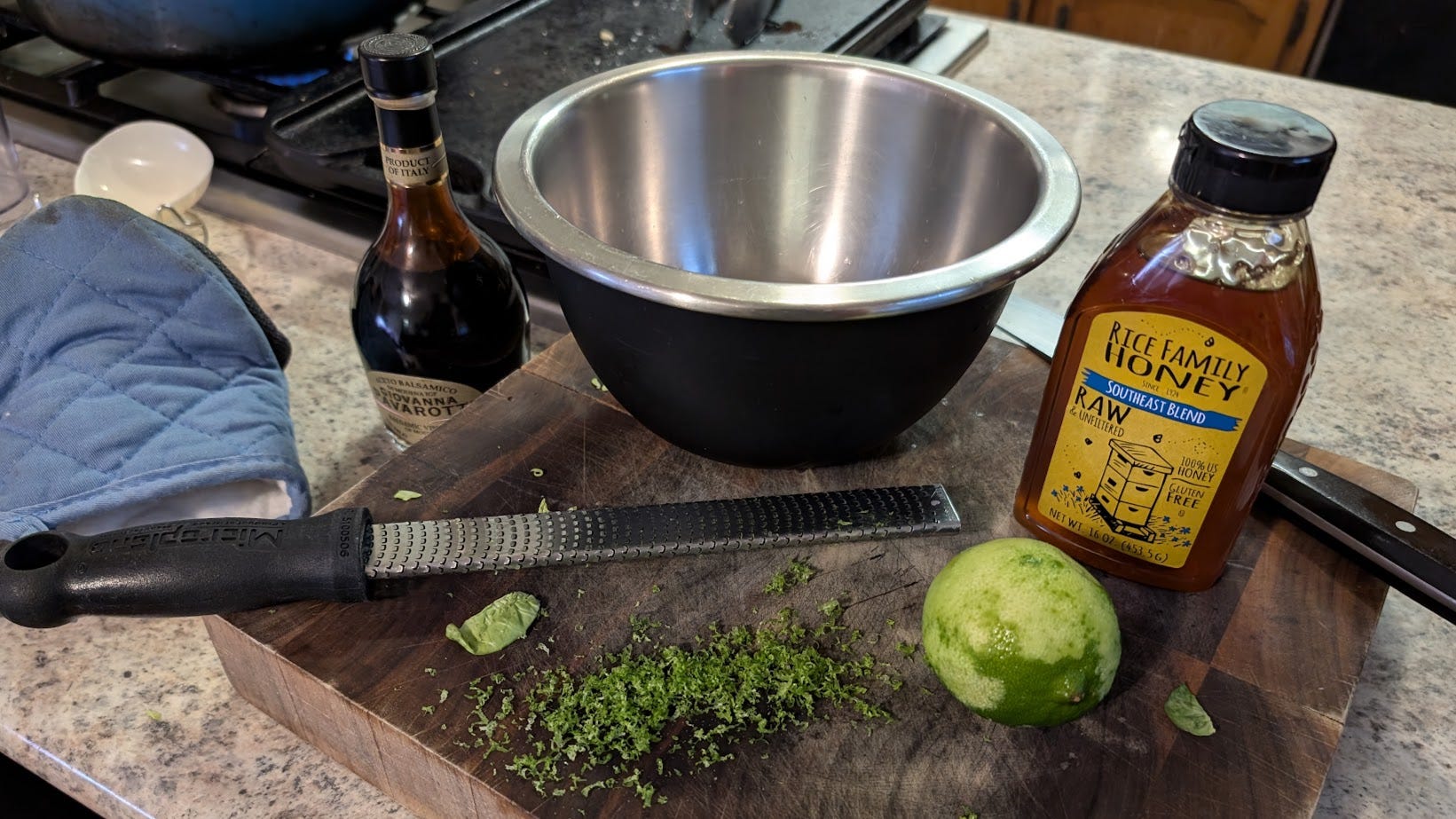 Take the honey, oil, and vinegar and mix it in a bowl. I like about 50/50 honey to balsamic and then slightly more olive oil than either. I end up correcting and adding more balsamic so “vibes and eyeballs.” As to how much, you’re just coating the sprouts. It doesn’t take much.